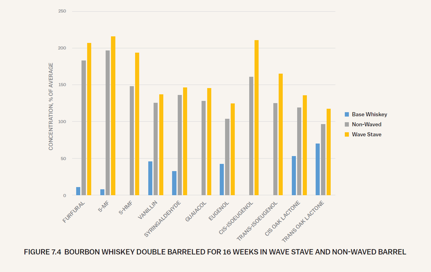 Results from another experiment help isolate the surface area variable further. Four-year-old bourbon whiskey was double barreled into a Wave Stave barrel as well as a barrel that features the same heat treatment (Traditional Medium Plus toast, Char #1) without the waved surface environment. Figure 7.4 presents the 16-week results, which indicate increased concentrations for all extractives for the Wave Stave barrel compared to the control and Non-Waved barrel.